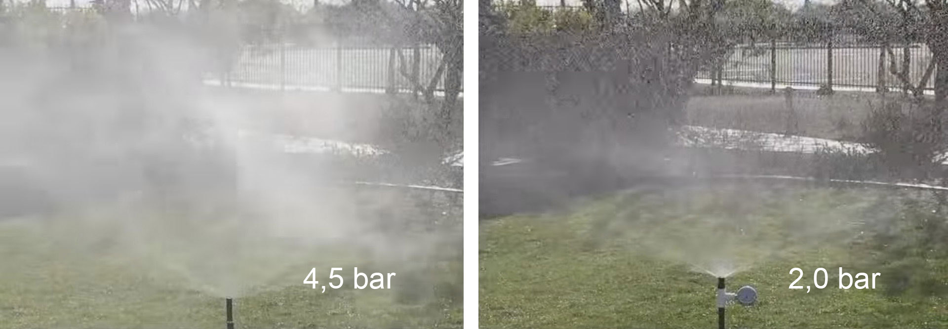 Slika ispod prikazuje dvije pop-up prskalice s istom diznom od kojih desna radi na predviđenom tlaku od 2,1 bar a lijeva radi na tlaku 4,5 bara. Pri povećanju tlaka iznad predviđenog vodene kapi usitnjavaju se čime se narušava uniformnost navodnjavanja i povećava potrošnja vode.