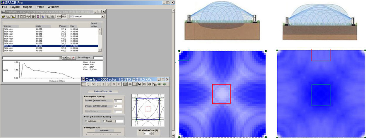 Uređaji renomiranih proizvođača obavezno prolaze testiranja. Među podacima se može uočiti i krivulja koja prikazuje količinu vode koju daje jedan raspršivač duž cijelog dometa. Iz krivulje je jasno vidljivo zbog čega se kod raspoređivanja pazi da međusobna udaljenost susjednih raspršivača uvijek bude manja ili jednaka njihovu dometu.