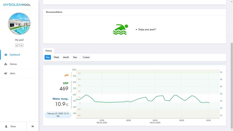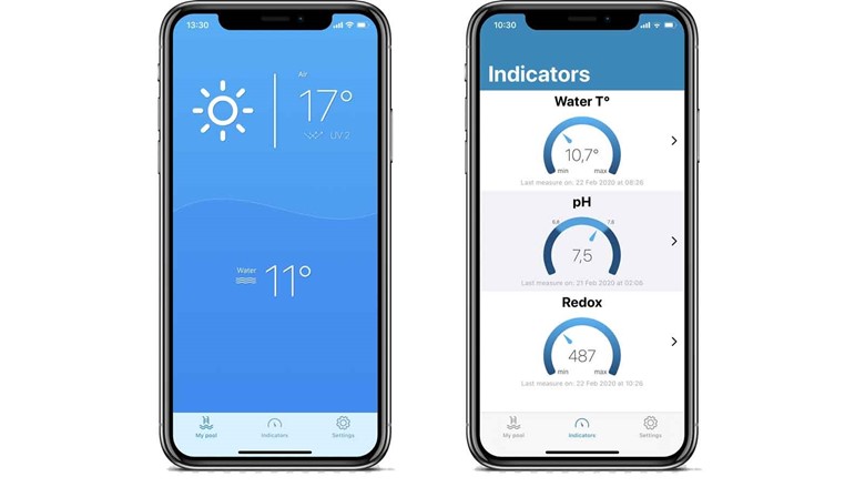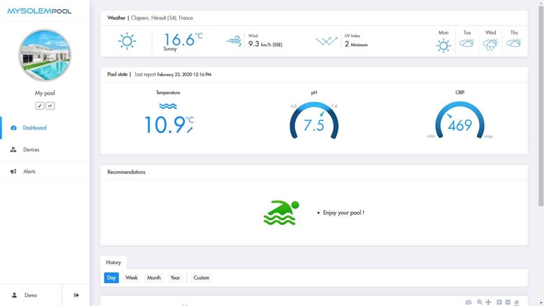 Besplatna aplikacija MYSOLEM za iOS i Android uređaje na zaslonu prikazuje podatke o vanjskoj temperaturi, temperaturi vode u bazenu i UV indeksu. Na ekranu s prikazom indikatora stanja vode u bazenu prikazuju se vrijednosti temperature vode, pH i ORP.
