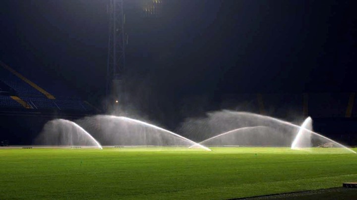 U prikazanom tipskom rješenju po tri uređaja u sredini terena spojeni su preko jednog elektro ventila i rade istovremeno. Ovisno o raspoloživoj količini vode i pritisku moguće je povezati više ili manje uređaja na jedan elektro ventil, uz odgovarajuću prilagodbu profila cjevovoda.Ž